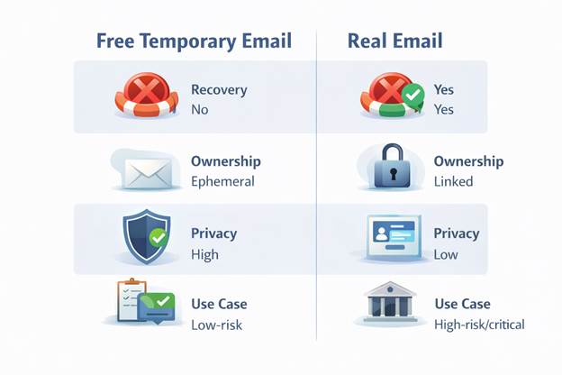Temporary email addresses are free to use, making non-critical verification easier. In high-stakes scenarios, real-world accounts are required for security and recovery.